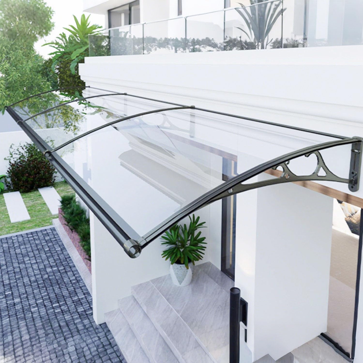 A variety of colors and sizes are available. You can choose the color of the awning bracket and panel according to your preferences. Believe us, you will not go wrong nowOther features:Light weight: Easy to install compared with glassDurability: PC The board is not easy to breakThermal insulation: low thermal conductivity, good thermal insulation performance, can effectively block heat transfer and reduce indoor temperature fluctuationsLight transmittance: light transmittance can reach 85% - 90%, can provide sufficient natural lightingCleanliness: automatic cleaning, rain flows down along the arc, washing away surface dustMain functions: blocking ultraviolet rays, rainproof, snowproof, waterproofInstallation: with installation accessories, easy installation by 2 peopleLength against the wall: more than 80cm, can be extended at willExtended arc: 60-150cmPackaging: panel, bracket, sealing strip, front aluminum strip, rear aluminum strip, screws